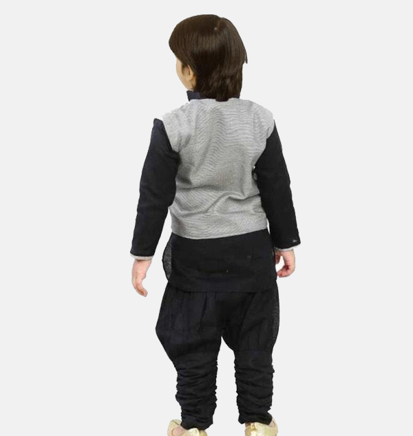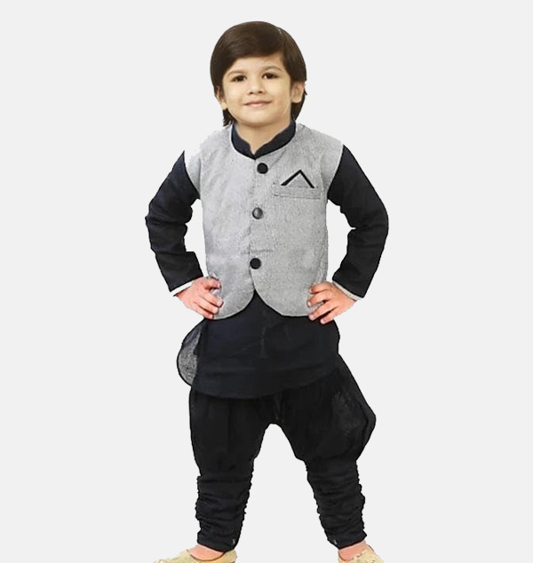 This elegant kurta set is designed in soft cotton blend fabric paired with a luxurious Dupion silk waistcoat, making it a perfect ethnic choice for festivals, family gatherings, or special occasions. The set comes with a long-sleeve kurta, churidar bottoms, and a stylish waistcoat that enhances the traditional look while keeping comfort in mind.