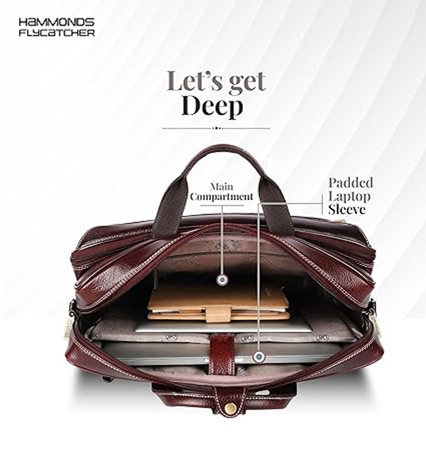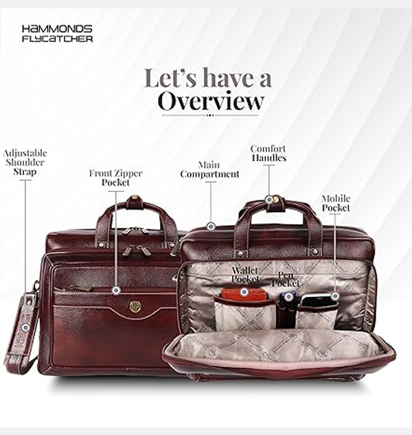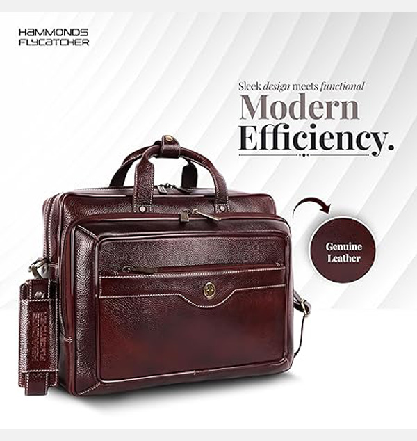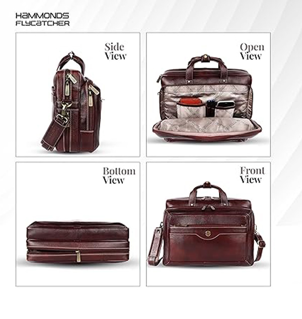 HAMMONDS FLYCATCHER Genuine Leather Expandable Office Bag for Men with Trolley Strap, Adjustable Strap, 15.6 Inch Leather Laptop Bag for Men for Office, Travel, Daily Use - 1 Year Warranty - Brown