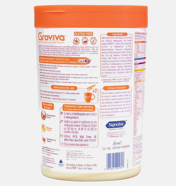 GrovivaTM is a customized wholesome child nutrition brand made as per ICMR guidelines . GrovivaTM is scientifically formulated with 38 key nutrients wherein Certi 5TM signature nutrients support the daily nutrition in children.