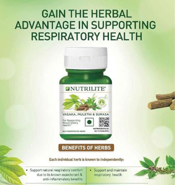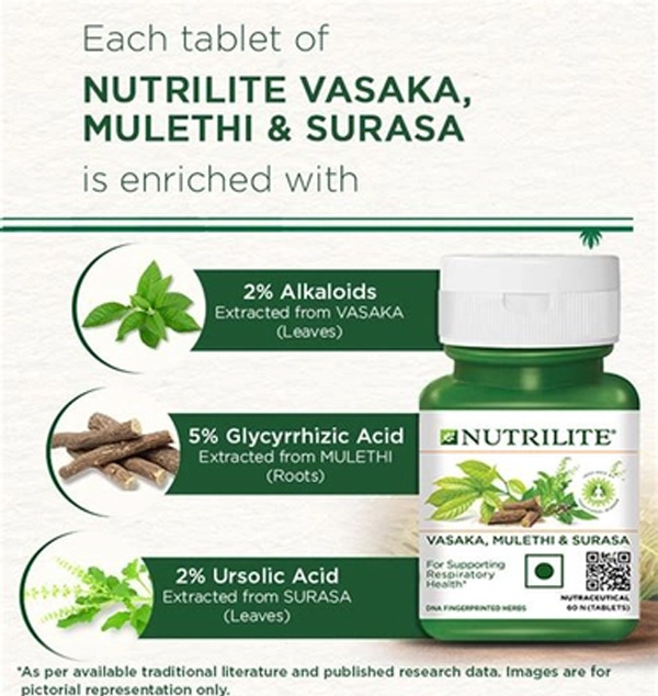 Nutrilite Vasaka, Mulethi and Surasa uses time-tested herbal ingredients to support respiratory health. Each Individual Herb is known to independently support natural respiratory comfort due to its known expectorant & anti-inflammatory benefits.