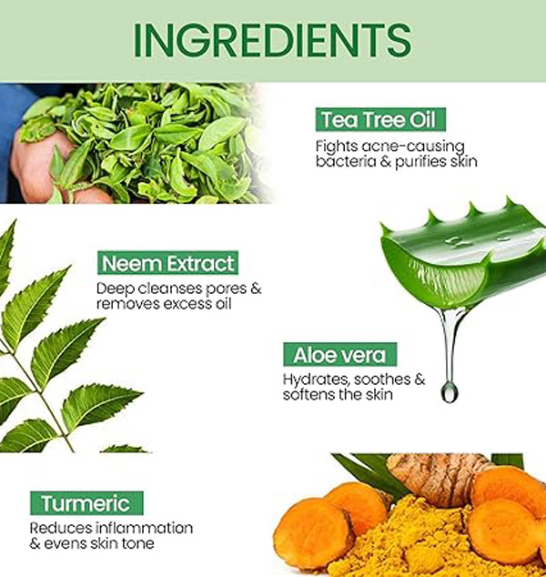 DEEPLY CLEANSING FORMULA: Infused with neem, tea tree oil, and curcumin, this face wash effectively removes dirt, excess oil, and impurities, leaving your skin feeling fresh and rejuvenated OIL CONTROL AND ACNE PREVENTION: The natural ingredients help regulate sebum production, preventing clogged pores and reducing the occurrence of acne and pimples