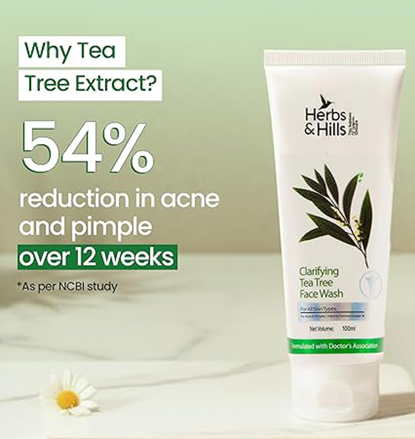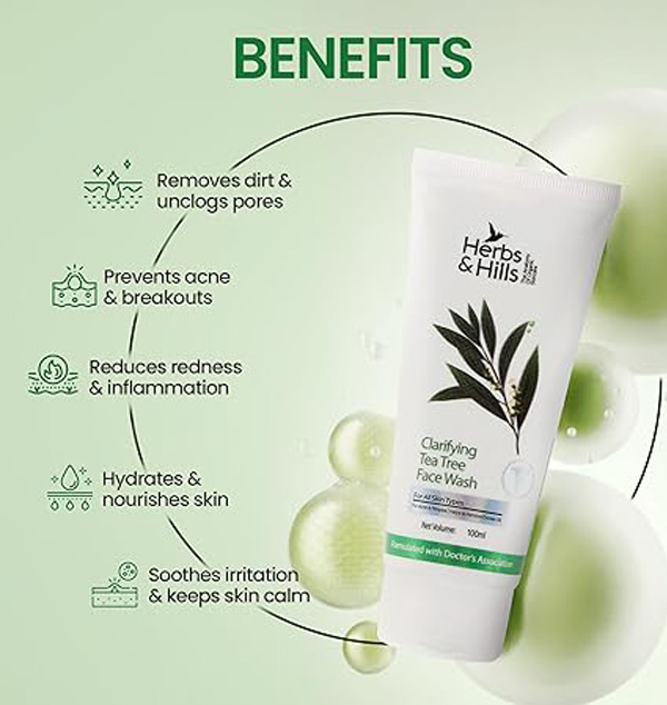 Herbs & Hills Clarifying Tea Tree Face Wash, Natural Gel Cleanser with Neem, Tea Tree Oil & Curcumin, Deep Cleansing, Oil Control & Acne Prevention for All Skin Types, 100ml