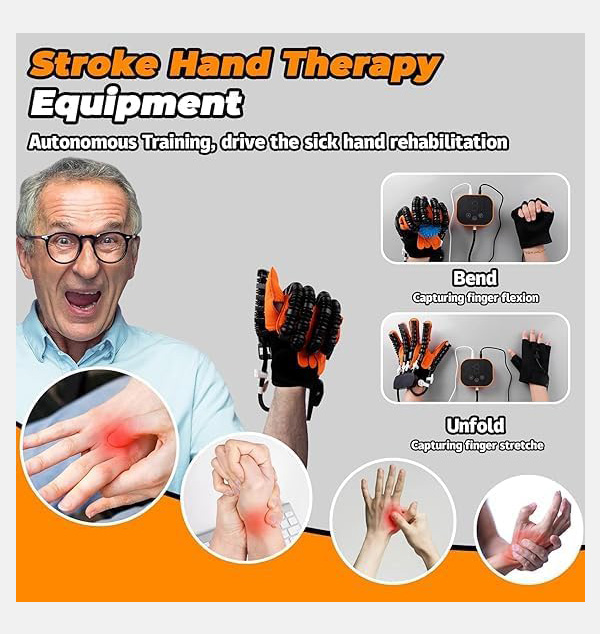 Rehabilitation Robot Gloves, Finger Exerciser for Stroke Recovery, Hemiplegia Hand Strengthening Devices, Hand Massage Training Equipment Rehabilitation robot glove finger training equipment stroke hemiplegia hand function training glove is a pneumatically driven device that is used for rehabilitation of hand muscle strength, joint mobility, stroke, hemiplegia and other aspects of hand movement disorder patients. Robotic hand rehabilitation exercises can be completed alone at home, including flexion, extension, grasping, etc. The operation is simple and the elderly can also operate and use it easily. Product Name: Robotic Rehabilitation Gloves Product Color: Orange Product Size: 105mm × 88mm × 41mm / 4.13'' × 3.46'' × 1.61'' Applicable People: Teenagers, middle-aged, adults Product Weight: Host about 199 grams, gloves about 200 grams Product Function: Assist hand training Usage Recommendation: 2-3 times a day, 15 minutes each time Product Output: 5V/2A Main Components: Host + rehabilitation gloves How to Use: 1. Connect the interface cables to the host in sequence 2. Put your hand into the glove and place it in the appropriate position 3. Turn on the device and you can use it