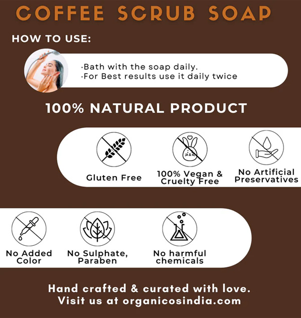Aromatherapy Benefits - Energizes & invigorates the mind, improves focus & alertness, relieves stress & uplifts mood, enhances feelings of positivity and well-being. 100% Natural & Handmade - No chemicals. No nasties. Crafted with love in small batches. No Synthetic Colours or Artificial fragrances - Coloured solely with Coffee & Cypriol Powder. Infused with a captivatingly aromatic blend of Coffee & Vanilla Essential Oils to soothe both your senses and your skin.