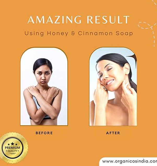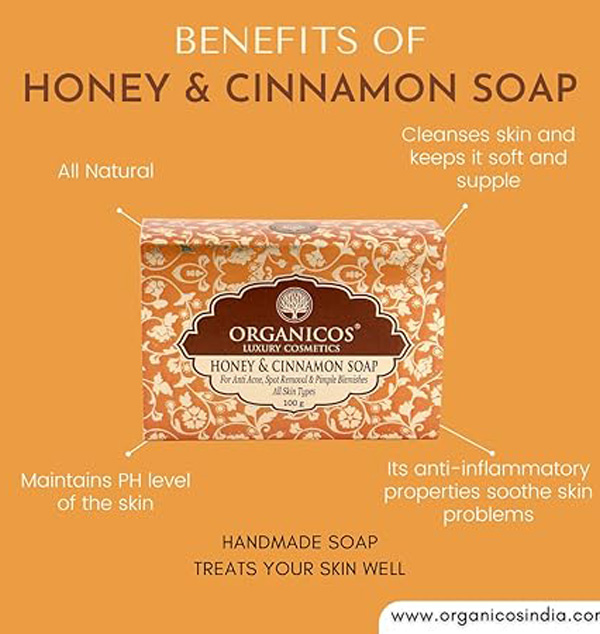 Organicos Honey & Cinnamon Soap is a luxurious blend crafted to elevate your bathing experience. This handcrafted soap is meticulously created using the finest natural ingredients, carefully selected to provide a harmonious combination of nourishment, gentle cleansing, and captivating fragrance. Indulge your senses as the warm, sweet scent of honey and the aromatic spice of cinnamon envelop you, creating a captivating and invigorating atmosphere. The natural essence of honey offers a delicate sweetness, known for its moisturizing properties, leaving your skin feeling hydrated and supple. Cinnamon, with its warm and rich aroma, adds a touch of indulgence to every use. This beloved spice is believed to have various beneficial properties, including its ability to promote circulation, leaving your skin looking revitalized and refreshed. Our Honey & Cinnamon Soap is handcrafted with care, ensuring that each bar is a work of art. The soap is made using traditional methods, combining a blend of nourishing oils and butter to create a luscious lather that gently cleanses your skin without stripping away its natural oils. Enriched with the goodness of natural ingredients, this soap provides a soothing and gentle cleansing experience suitable for all skin types. It helps to remove impurities, leaving your skin feeling soft, smooth, and rejuvenated after every use. Immerse yourself in the luxurious lather and let the exquisite blend of honey and cinnamon envelop your senses. As you wash away the stresses of the day, the aromatic scent will uplift your mood and create a truly indulgent bathing ritual. Pamper yourself or surprise your loved ones with our Honey & Cinnamon Soap. Its elegant packaging makes it a perfect gift for any occasion. Experience the harmonious combination of sweet honey and warm cinnamon, and elevate your bathing routine to new heights of indulgence and luxury.