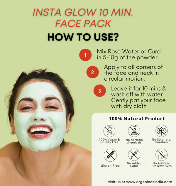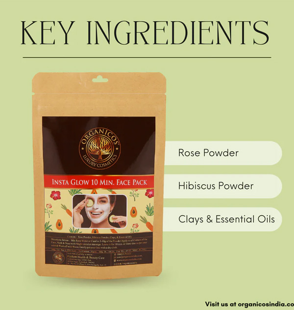 SKIN BEAUTIFYING : Organicos Insta Glow face pack for women comes in powder form which can be used before bath everyday for exceptionally beautifying skin enhancing the radiance and health for all skin types; Organicos Insta Glow face pack for glowing skin products are handmade Pure ayurvedic and Natural NATURAL INGREDIENTS: Organicos Insta Glow face pack for women & Man for glowing skin has the goodness of natural antioxidants like and Rose Powder Clay and Essential Oils and the holiness of Hibiscus which will help your skin to cleanse deeply clearing the dirt inside the pores; this herbal bath powder unique blend of ingredients used to prepare this face pack powder softens and smoothes while effectively cleansing and exfoliating