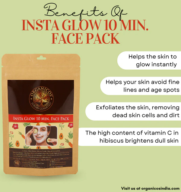 Organicos Insta Glow 10 Face Pack Powder for Skin Whitening Tan Removal Face Scrub Moisturize Cleanse Tone and Rejuvenate Your Skin With Hibiscus and Rose Powder Clay and Essential Oils