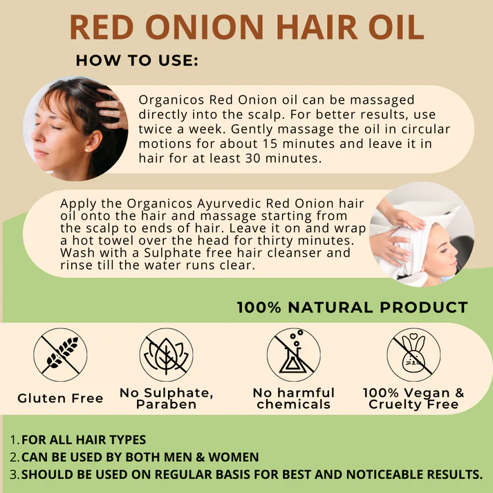 The Red Onion Hair Oil can be used on the scalp directly. Use it twice a week for the greatest results. Massage the oil into your hair for about 15 minutes in a circular motion, then leave it in for at least 30 minutes.