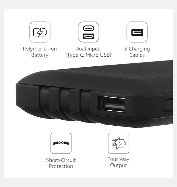 10000 mAh Polymer Li-ion battery Four way output and dual input ports. Comes with 3 cables - Type C, Micro USB and iPhone Cable Overcurrent, overvoltage and short circuit protection Thermal shutdown aids protection from overheating Adaptive charging current adjustment Compact design - rubber body with smooth edges, additional mobile holder