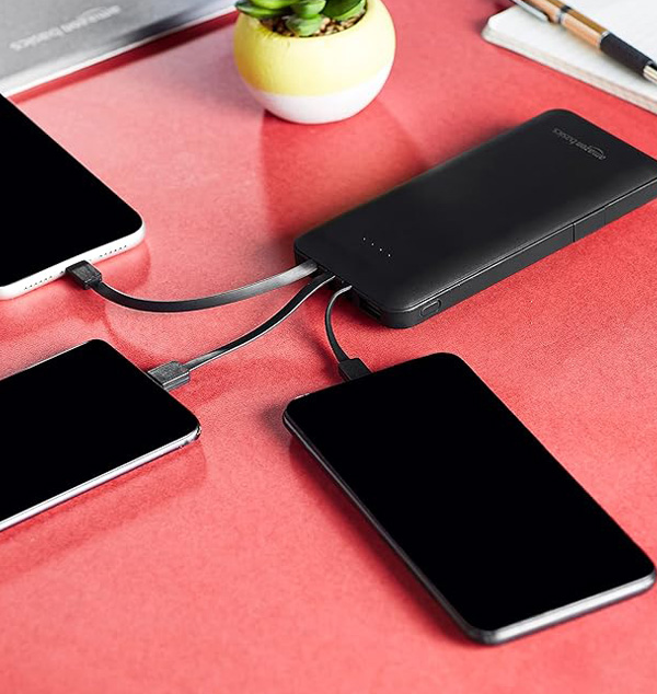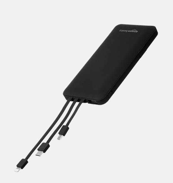 AmazonBasics 10000mAH Lithium Polymer Power Bank | 3 Charging Cables Included | Four Way Output (Micro USB, Type C, iPhone Cables and 1 USB Port), Dual Input (Type C, Micro USB) | Black
