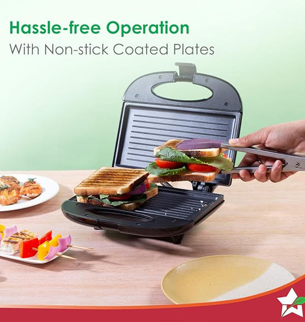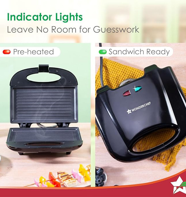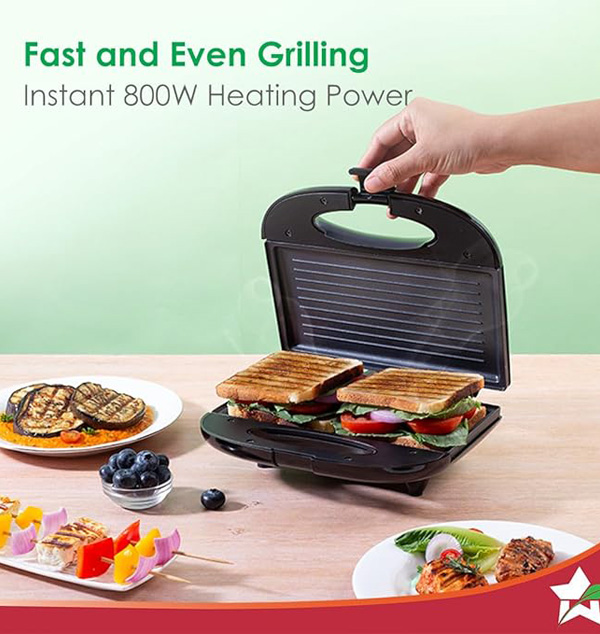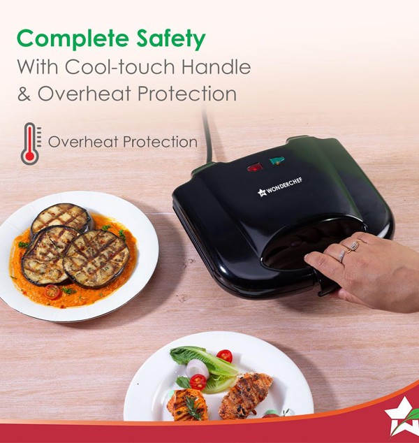 Make the most delicious and crispy grill sandwiches flawlessly with Wonderchef Prato Plus Griller Healthy Non-stick Coating: The grill plates are made from food-grade non-stick coating over die-cast aluminium which enable even heat distribution and durability. Sleek Black Finish: A sleek black finish not only adds an elegant look to the griller, but also makes it easy to clean and maintain. 800W Heating Power: A powerful 800-watt heating element ensures quick heating and efficient cooking of sandwiches.