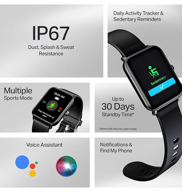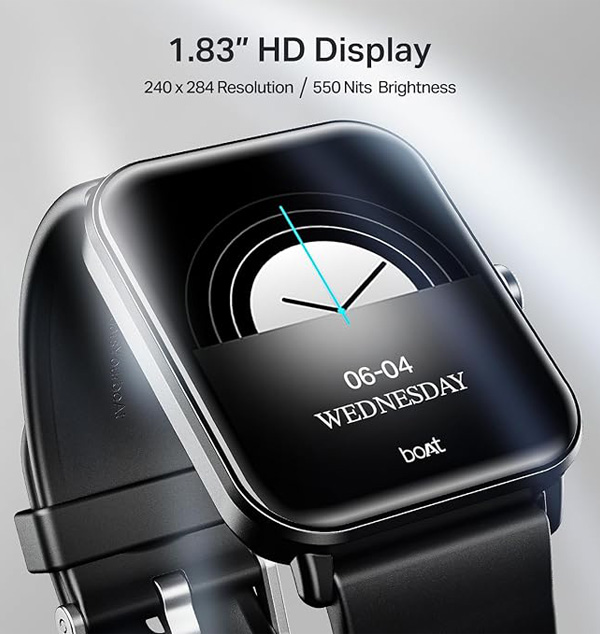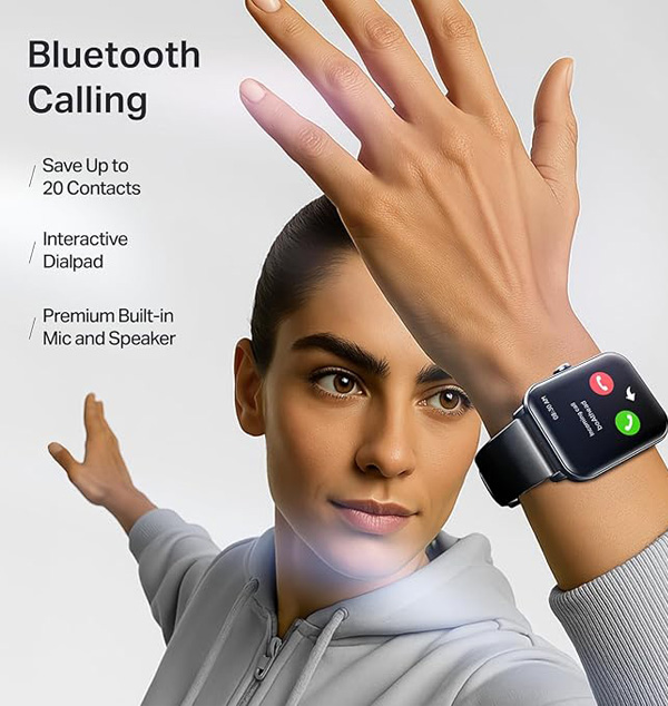 1.83â€HD Display with Wake Gesture: The large 4.64 cm (1.83â€) HD display stands out with 240x284 resolution and 500 nits brightness, offering a crystal-clear view even under bright sunlight—perfect for outdoor visibility. The wake gesture makes it super convenient to check time and updates. Functional Crown: Use the functional crown to scroll through menus or change watch faces with a simple twist or tap. It’s especially useful when your hands are wet or sweaty, or you're wearing gloves. Bluetooth Calling: With a premium built-in mic and speaker, conversations stay crisp whether you're on the move or chilling. Use the interactive dial pad and saved contacts to call without even pulling out your phone.