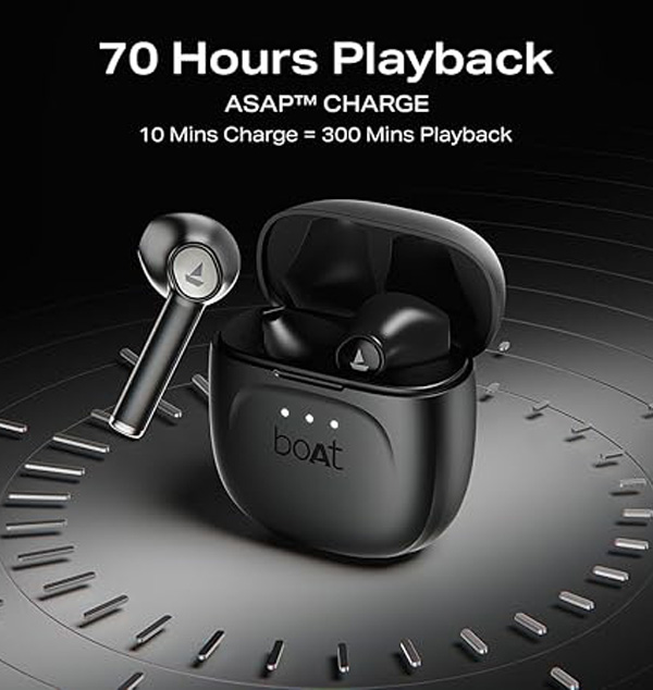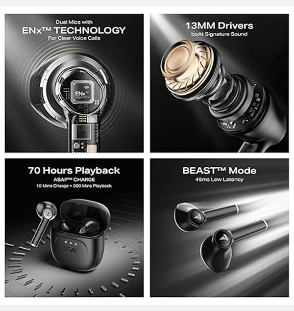 Escape into the realm of captivating sound with the boAt Airdopes 138 Gen 2 TWS Earbuds. Designed with powerful 13 mm drivers, these earbuds deliver bass-rich boAt Signature Sound that makes every movie, playlist, and podcast more thrilling. Enjoy up to 70 hours of non-stop entertainment, perfect for long commutes, weekend trips, or just losing yourself in your favourite tunes. Level up your gaming sessions with BEAST™ Mode’s 45 ms low latency, ensuring perfect sync between audio and visuals for a smooth, immersive experience. And when it’s time to connect, the ENx™-powered dual mics cut through background noise, giving you crystal-clear calls whether you’re on the metro, at a café, or in a bustling airport. Control your music and calls in a flash with responsive button controls and jump straight into the action with Insta Wake N’ Pair as your Airdopes connect the moment you pop open the case. Thanks to Bluetooth v5.4, you can enjoy stable, hassle-free wireless connectivity every time. And, if your buds are running low on battery, ASAP™ Charge has you covered with a massive 300 minutes of playtime from just 10 minutes of charging. Plus, with IPX4 splash and sweat resistance, your Airdopes are always ready for workouts, poolside hangouts, or rainy-day playlists without missing a beat.