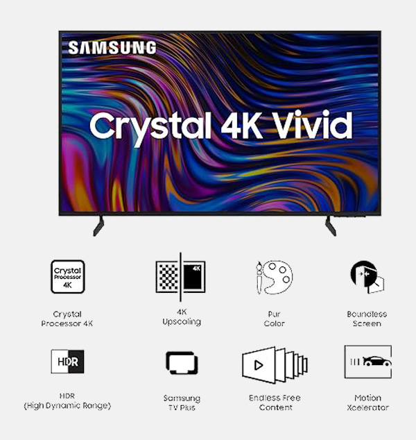 Display Features: Crystal Processor 4K | PurColor | 4K Upscaling | HDR 10+ Support | HDMI Black Level | Mega Contrast | UHD Dimming | Contrast Enhancer | Motion Xcelerator | Filmmaker Mode || Additional Features: Endless Free Content | Samsung Knox Security (Your privacy. Secured.) | ConnectShare | TV Key