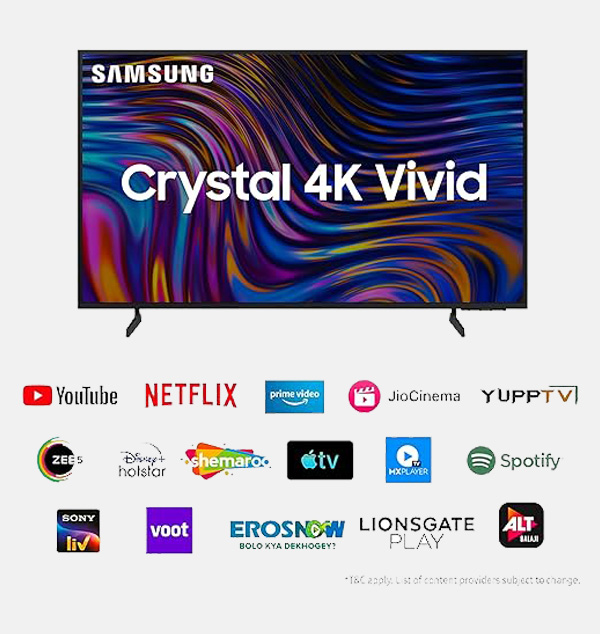 Resolution: 4K Ultra HD (3840 x 2160) Resolution | Refresh Rate: 50 Hertz. Sound Features: 20W Output- 2CH | Powerful Speakers with Q-Symphony | Object Tracking Sound | Bluetooth Audio | Adaptive Sound Smart TV Features : Bixby Voice Ready (Control your Crystal UHD TV with Bixby Voice through SmarThings App) | Works With AI Speaker (Alexa and Google Assistant) | Mobile to TV Mirroring | Sound Mirroring | Wireless TV On | Buds Auto switch | Web Browser | SmartThings Hub / Matter Hub / IoT-Sensor Funtionality | Apple AirPlay | Daily+ || Gaming Features: Auto Game Mode (ALLM) | VRR | HGiG