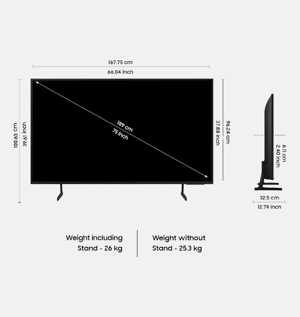 Samsung 189 cm (75 inches) D Series Crystal 4K Vivid Pro Ultra HD Smart LED TV UA75DUE77AKXXL (Black). Resolution: 4K Ultra HD (3840 x 2160) Resolution | Refresh Rate : 50 Hertz. Display Features: Crystal Processor 4K | HDR 10+ Support | Motion Xcelerator | Mega Contrast | UHD Dimming | Contrast Enhancer | Motion Xcelerator | 4K Upscaling | Filmmaker Mode || Other Convenience Features: Digital Broadcasting DVB-T2 | Analog Tuner | TV Key | 3 Side Bezel-less Design | SlimFit Cam Support | S-Share