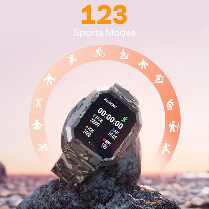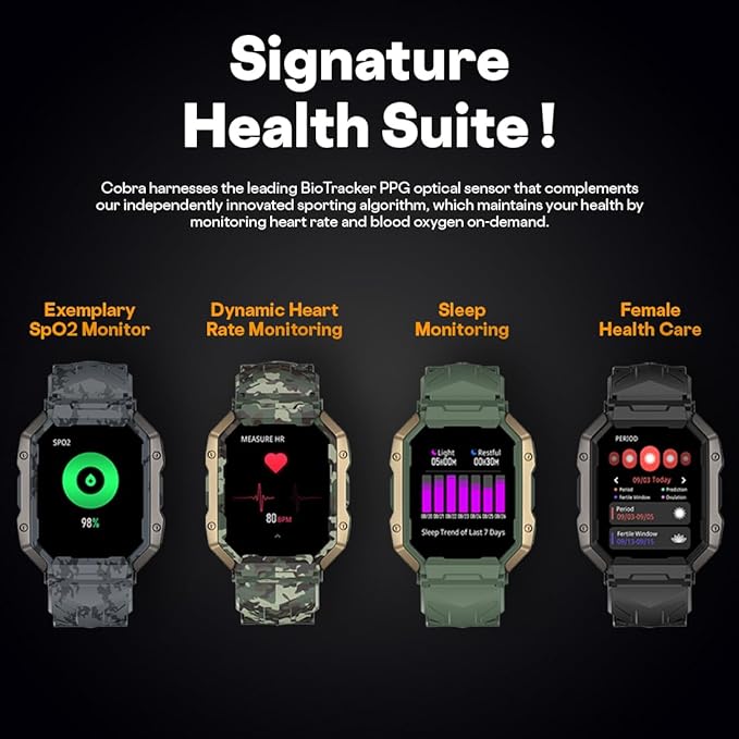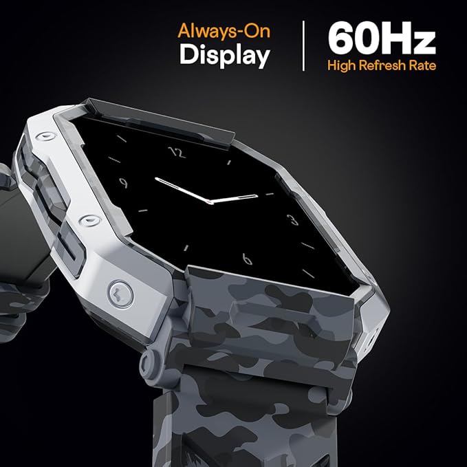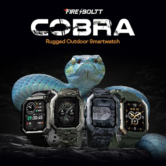 Vivid Visuals: The Cobra smartwatch offers a generous 1.78-inch AMOLED display, always on and vibrant, offering a crisp resolution of 368 x 448 pixels. Its smooth 60 Hz refresh rate ensures an immersive visual experience. Battle-Hardened Build: Crafted with an Army-grade design, the Cobra smartwatch flaunts a rugged, three-layer body shield, making it robust enough to withstand the toughest outdoor escapades. Seamless Connectivity: Embrace hands-free convenience with Bluetooth calling on the Cobra. Enjoy making and taking calls directly from your wrist, accompanied by the in-built voice assistance feature for added ease.