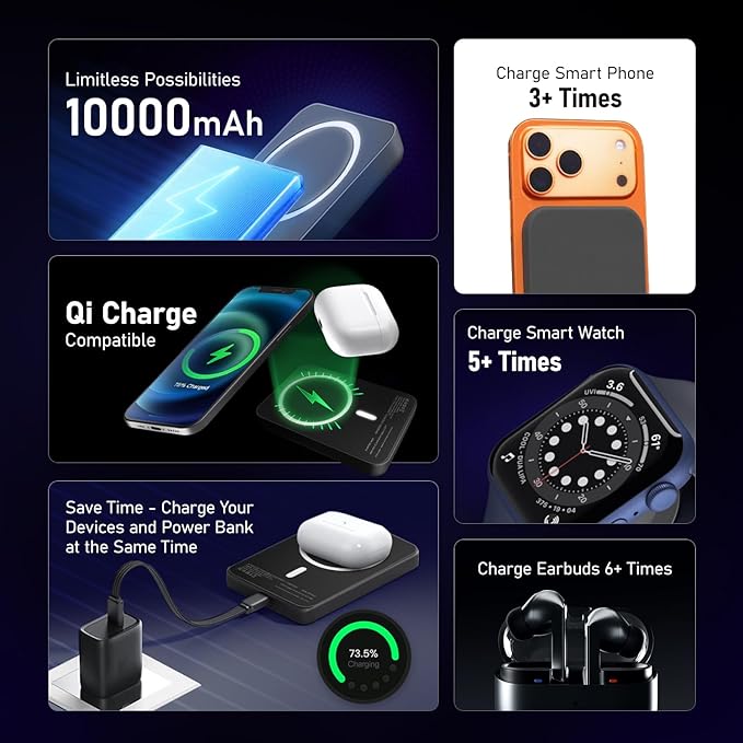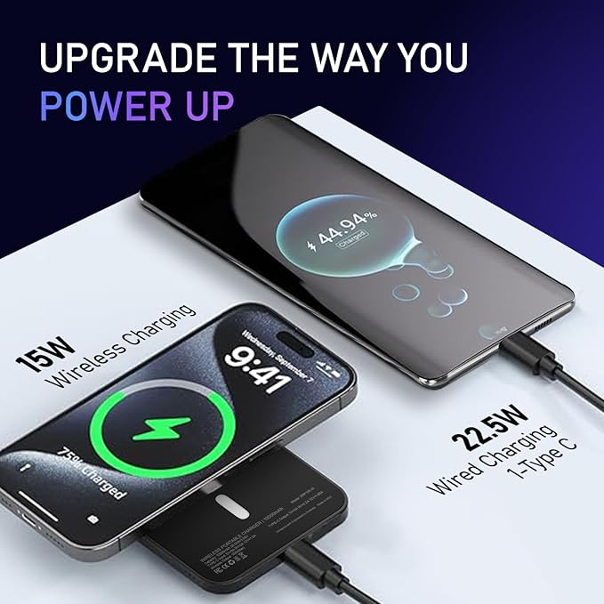 10000mAh High-Capacity Power - Charge your smartphone 2–3 times on a single charge with this powerful, high-density lithium-polymer battery—perfect for daily use, travel, or emergencies. 15W Wireless Fast Charging - Enjoy cable-free charging with 15W output for Qi-enabled devices. Just place your phone on top and power up instantly. Type-C Input & Output Port - One reversible USB Type-C port supports both fast input charging and output charging for your devices—simple, efficient, and clutter-free. Universal Device Compatibility - Works effortlessly with iPhones, Android phones, wireless earbuds, smartwatches, and other USB-C or wireless charging supported devices.