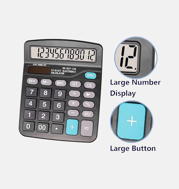 Calculators, KK-837-Standard Function Desktop Calculator, 12 Digit Large LCD Display, Battery and Solar Powered Basic Calculators for Office, Primary School, Market or Home Use