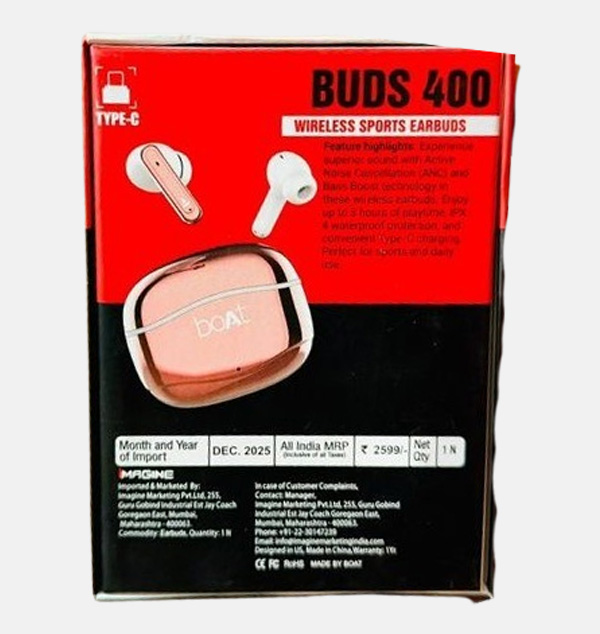 boAt Buds 400 wireless sports earbuds. Hybrid Active Noise Cancellation. Equipped with One Touch Voice Assistant support. Includes a Hearables App for customized functionality. The package mentions a 250-hour playback capacity.