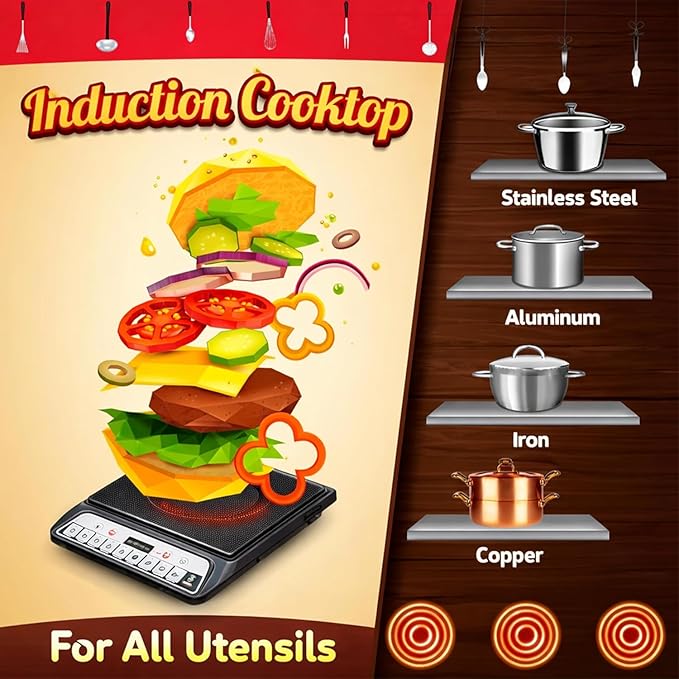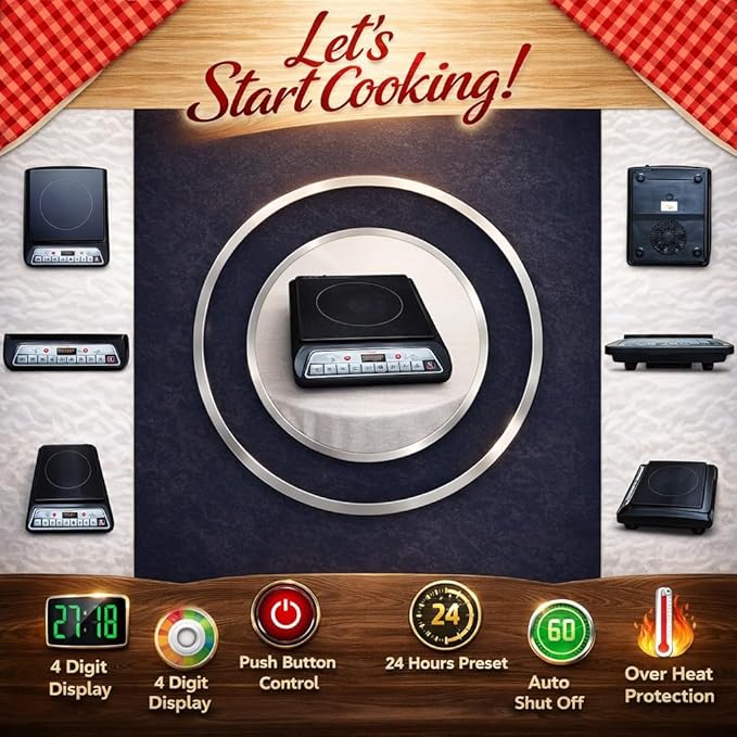 Cook faster and safer with the 2000W Induction Cooker featuring slide touch control, 4-digit display, 9 temperature levels, timer up to 4 hours, energy-efficient heating and crystal glass surface.