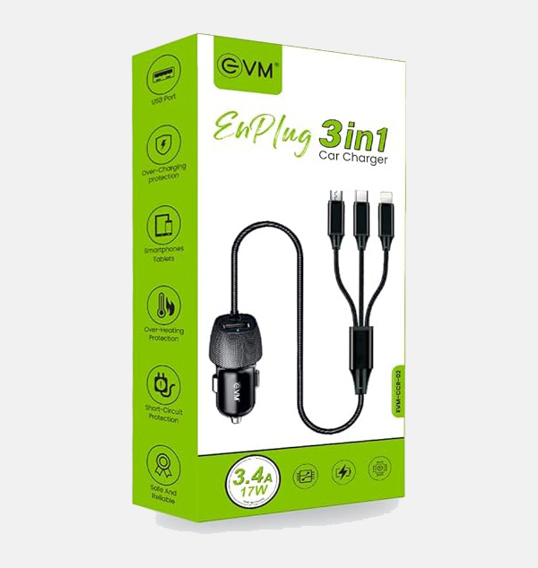EVM EnPlug 3in-1 Car Charger - Built-in Cable (Micro USB, Type-C, Lightn-ing) + USB Port, Fast Charging for Smartphones