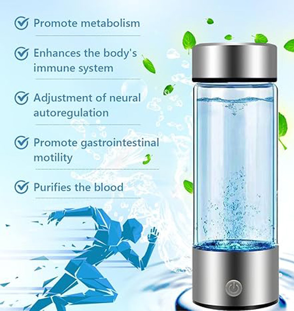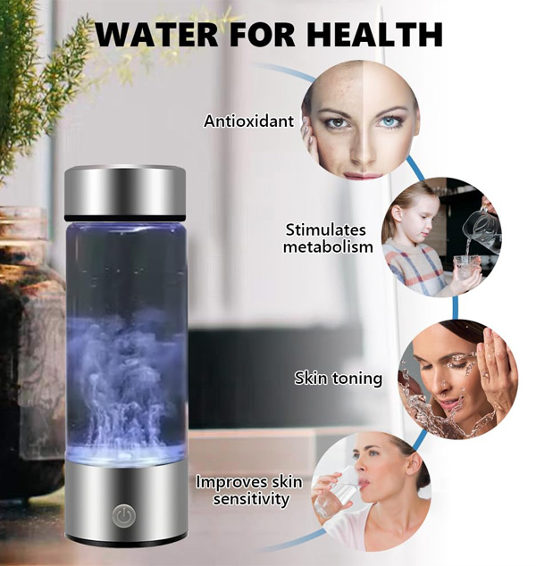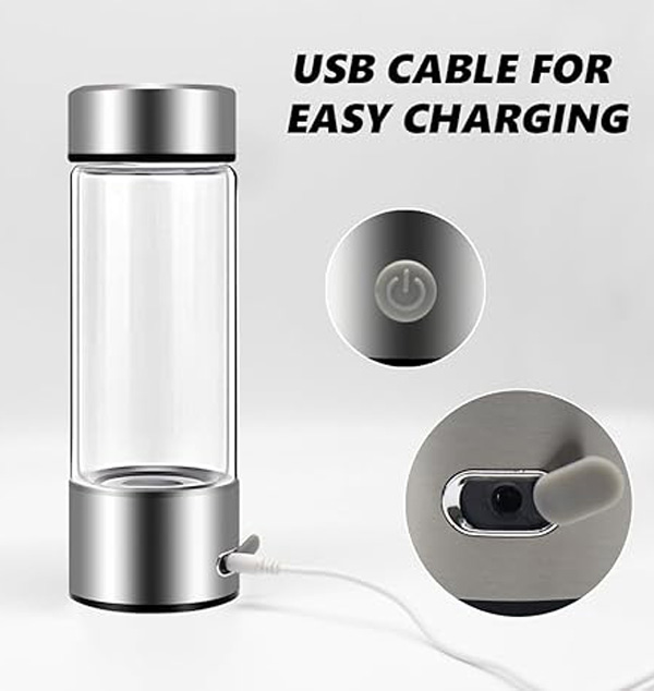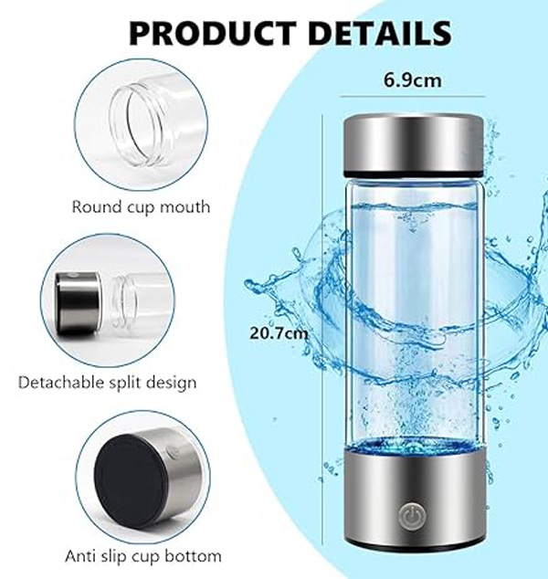 Product Name: Hydrogen Water Mug Colour: Silver Capacity: 420ml Usage: . 1. Pour into the water source 2. Plug in the power supply, press the button just started hydrogen production is the red light on 3. 3 minutes hydrogen production end automatically shut down Can be charged directly with the adapter distributed, can also be connected to the computer, charging treasure charging