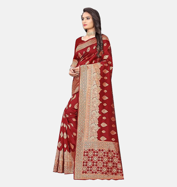 Material:- Banarasi Jacquard Silk; Work Type: Jacquard Weaving. Color: Maroon & Golden. It's the Perfect traditional that will lend effortless to Your Style.. Package Content: 1 Saree With Blouse Piece.