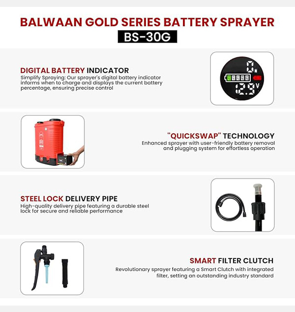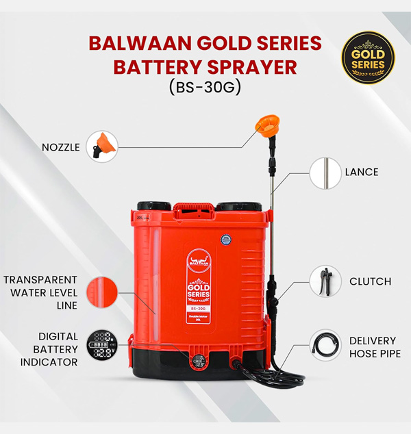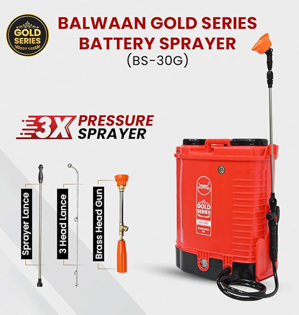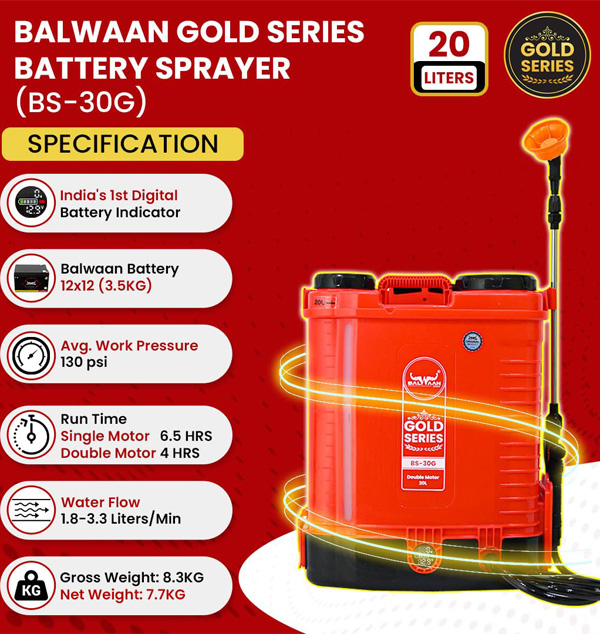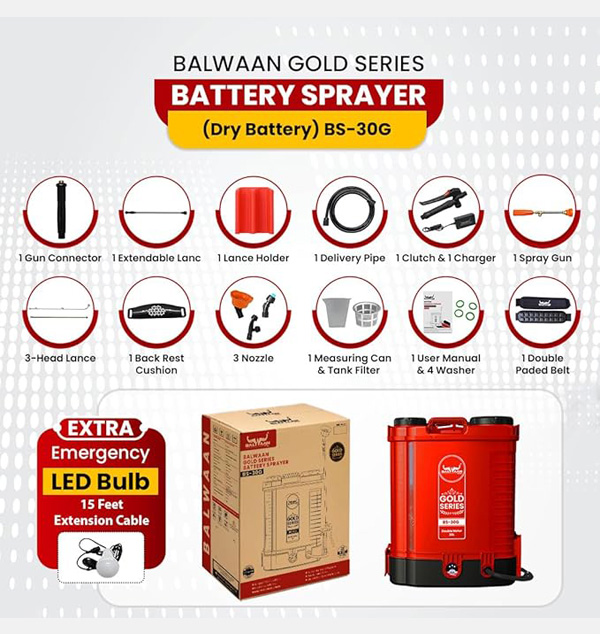 Balwaan Krishi Battery Sprayer Gold Series BS-30G, 12V 12A Double Motor | Digital Battery Indicator | 20L Tank | 3X Pressure Sprayer, Suitable for Long & Short Spraying | Free LED Bulb with 15ft Cable