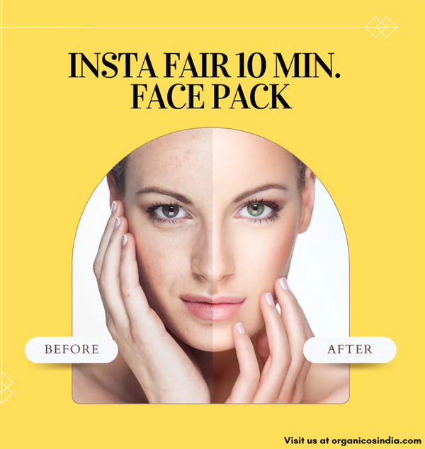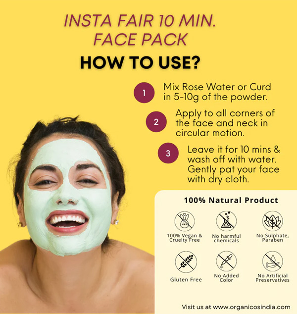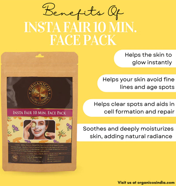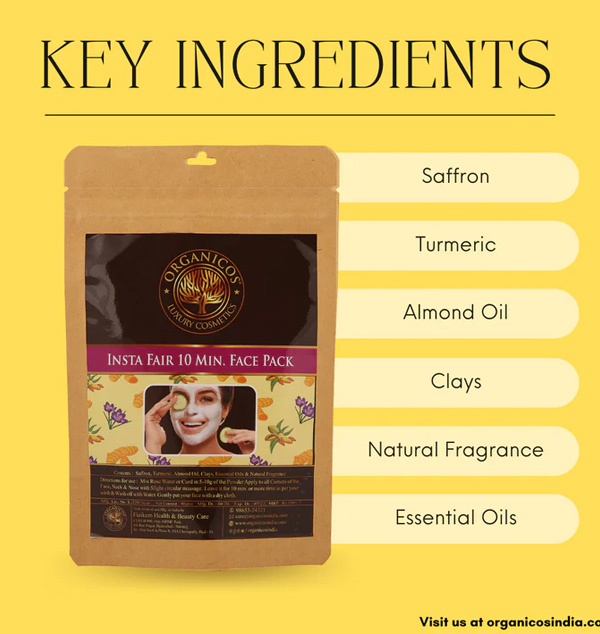 Organicos Insta Fair 10 Minute Face Pack Powder For Skin Whitening Tan Removal Face Scrub Moisturize Cleanse Tone And Rejuvenate Your Skin with Saffron Turmeric Almond oil Clays & Essential Oils