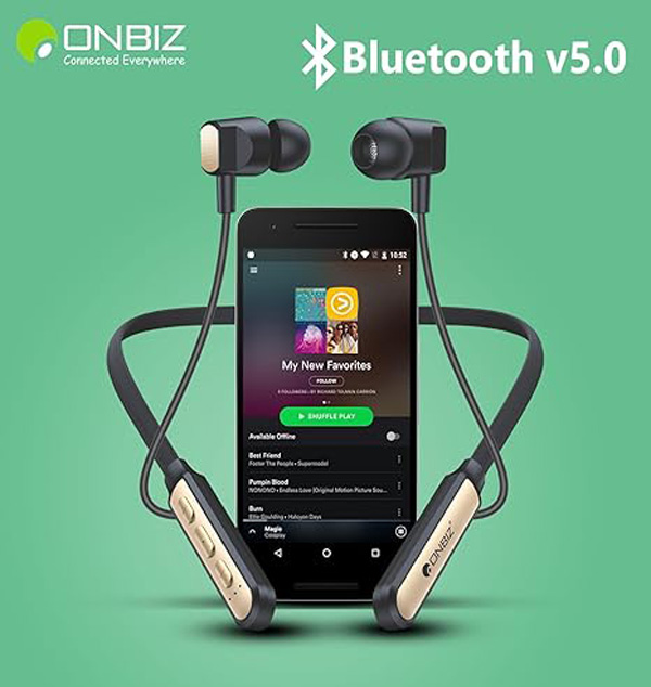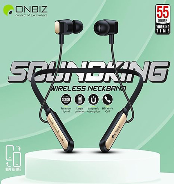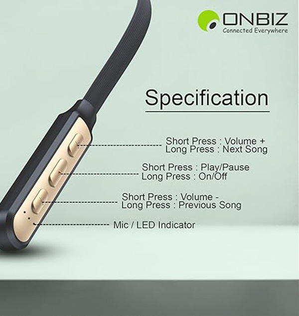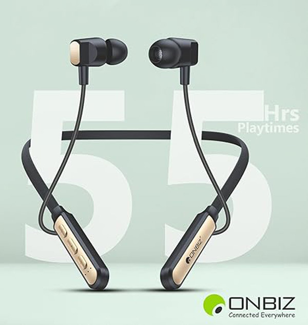 ONBIZ - A Wireless Neckband Design In India! Tune in to music, take calls and comes with an in-built mic so you can walk and talk and make sure you’re ready for whatever the day brings Once you try this wireless neckband, rated wireless neckband earphones are sure to change the way you enjoy sounds in your life!. It is equipped with high-capability rechargeable lithium polymer battery with 1hours of charging time that will allow you to listen to your music up to 55 hours straight.