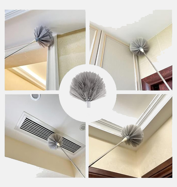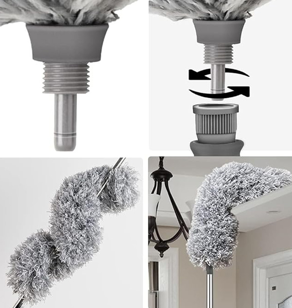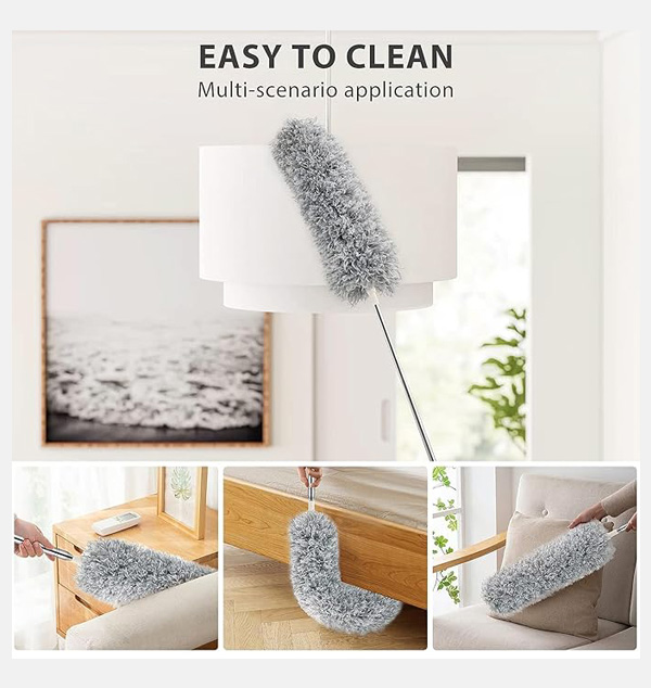 ð”ð©ð ð«ðšððžð ðŸðŸŽðŸŽ ðˆð§ðœð¡ ð„ð±ððžð§ððšð›ð¥ðž ðð¨ð¥ðž – Clean high ceilings, fan blades, AC vents, chandeliers, and walls without a ladder. The sturdy telescopic pole reaches up to 100 inches, giving you effortless access to hard-to-reach areas. ððžð§ððšð›ð¥ðž & ð€ð§ðð¢-ð’ðœð«ðšððœð¡ ðð«ð®ð¬ð¡ – The microfiber head bends up to 90°, allowing perfect cleaning around fan blades and corners without damaging surfaces. Designed to trap dust effectively while protecting your home.