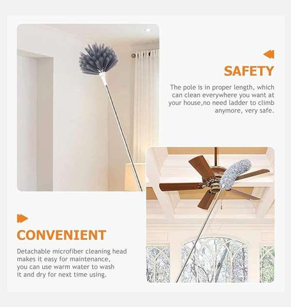 It is flexible, strong, easy to use and cleans any surface ,Very long handle, This microfiber cleaning wand is quite useful. Great design, my favourite features are the head's ability to rotate through a number of positions almost completely in a circle. and was simple to use, Excellent quality, very light weight reaches and cleans every corner of my home's roof quality of the metal part and the feather is good, very satisfied with the product, makes cleaning far corners so easy