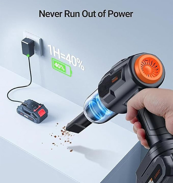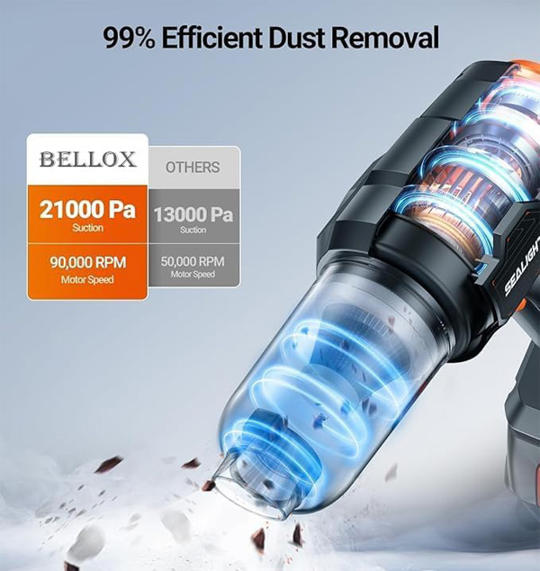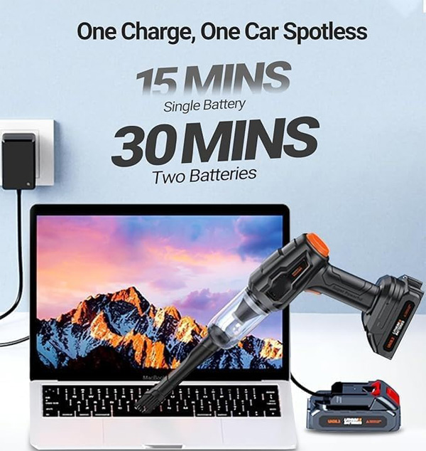 This upgraded model of car vacuum cleaner features a brushless motor and a large 12500mAH battery, providing enhanced suction and blowing power. It outperforms other car vacuums with a suction power of up to 21000PA and a blowing power of 260000RPM. This cordless car vacuum cleaner features an upgraded high-speed 21V/200w brushless motor, providing powerful performance.