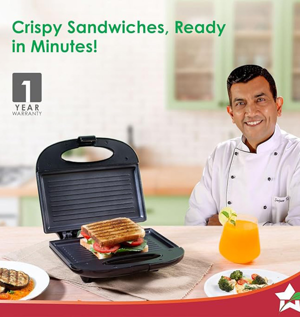 Make the most delicious and crispy grill sandwiches flawlessly with Wonderchef Prato Plus Griller Healthy Non-stick Coating: The grill plates are made from food-grade non-stick coating over die-cast aluminium which enable even heat distribution and durability. Sleek Black Finish: A sleek black finish not only adds an elegant look to the griller, but also makes it easy to clean and maintain. 800W Heating Power: A powerful 800-watt heating element ensures quick heating and efficient cooking of sandwiches.