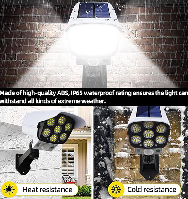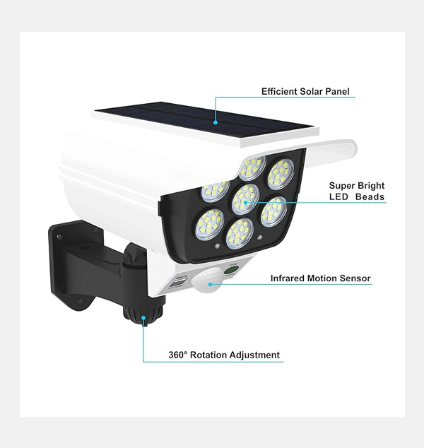 - 2 in 1 Solar Light & Security Dummy Camera - Keep your home property safe and intruders away. With 77 Bright LED, motion-activated, sleek Low profile design. Plus realistic dummy security camera. Detect Intruders Stay away from your household. - 3 Lighting Mode Optional - 1.Weak light mode at night, strong light mode on when motion detected; 2.Strong light mode always on; 3.The strong light mode always provides up to 40 hours of use time in the low light mode. The additional solar panels can be easily installed wirelessly and absorb solar energy in the sun, thus saving the environment and energy.