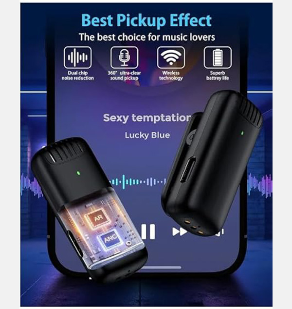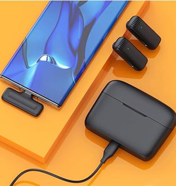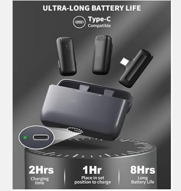 DUAL CHANNEL SYSTEM: Features two wireless microphones with independent channels for simultaneous recording, perfect for interviews and dual-speaker content creation UNIVERSAL COMPATIBILITY: Comes with both Type-C and Lightning connectors, making it suitable for various smartphones and devices with plug-and-play functionality CHARGING CASE: Portable charging case provides extended battery life and convenient storage for microphones when not in use NOISE REDUCTION: Advanced noise reduction technology ensures clear audio capture while minimizing background interference and unwanted sounds