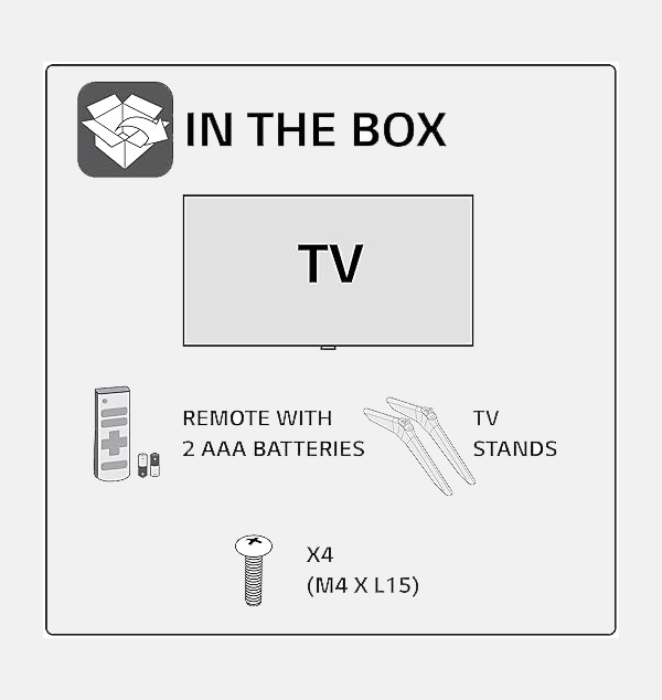 | Mounting Hardware | 1 HD TV, 1 Remote Control with 2 AAA Batteries, 1 Table Top TV Stand |