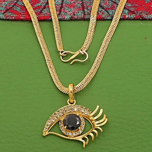 The material of the Gems Pendant is brass which is gold polished. This gold polished brass defines in the inner portion of the eye. The lashes of the eye contains same material and properly defined.