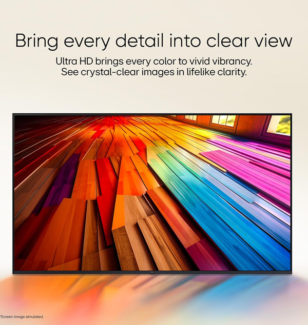 Resolution: 4K Ultra HD | Refresh Rate: 60 Hz Native| 178-degree wide viewing angle. Sound: 20 Watts Output | AI Sound Pro (Virtual 9.1.2 Up-mix) | Dolby Atmos | Clear Voice Pro (Auto Volume Leveling) | AI Acoustic Tuning | Sound Sync | Sound Mode Share | Simultaneous Audio Output | Bluetooth Surround Ready (2 Way Playback) | Down Firing Speakers