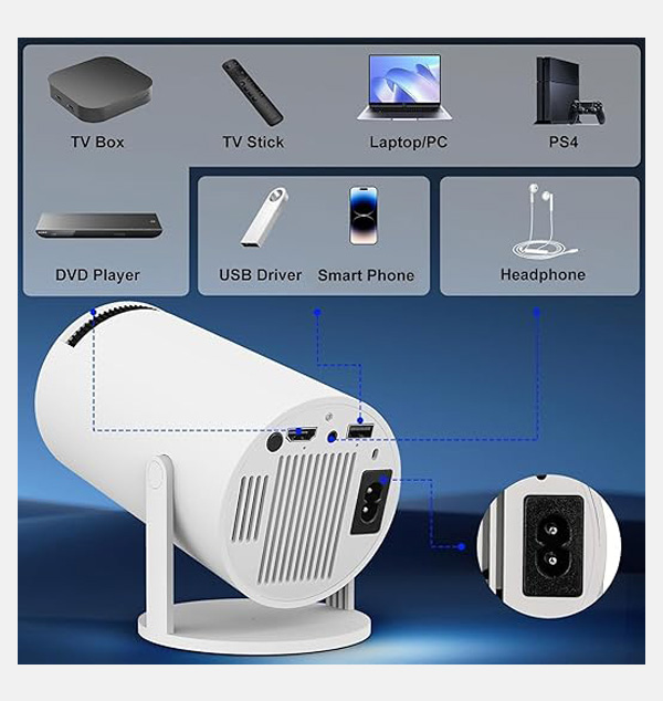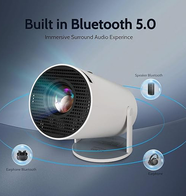 ?WIFI 6 Wireless Smart Projector?Say goodbye to traditional HDMI cable conversion projection, this smart projector is built-in WiFi6. Faster transmission rate and lower transmission delay, easily and quickly connect to smartphones, laptops, etc., within 5 seconds to connect successfully, to achieve fast and stable projection of video, games and so on. ?BT 5.0 & Speaker Function?The portable projector has built-in Bluetooth 5.0 chip and speakers, you can pair the projector with headphones, speakers or other audio devices via Bluetooth technology, or directly through the projector speakers to enjoy a cinema-quality audio-visual experience and enjoy videos anytime and anywhere. ?180° Rotatable Mini Projector?The projector base includes a 180° rotating bracket that allows you to orient the projector in various directions, from wall to ceiling. You can view at any angle from 40 to 130 feet with a clear image on the screen.