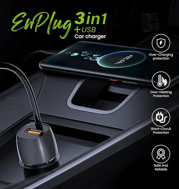 EVM EnPlug 3in-1 Car Charger - Built-in Cable (Micro USB, Type-C, Lightn-ing) + USB Port, Fast Charging for Smartphones